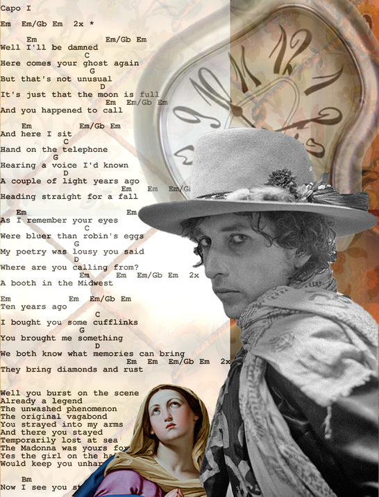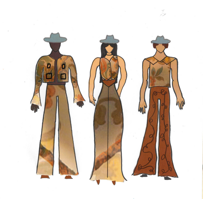 this project focused on the garment conceptualization process - from mood board to textile to digital DEsign. using adobe photoshop and Indesign, I created a digital mood board inspired by the relationship between artists bob dylan and joan baez, and their rumored breakup song Diamonds and Rust. Drawing upon the song's themes of heartbreak, lost love, and the physical color/texture of rust, I used grounding earth colors in silhouettes common in the time that the song came out, 1975, to create a 70s-western aesthetic clothing design.