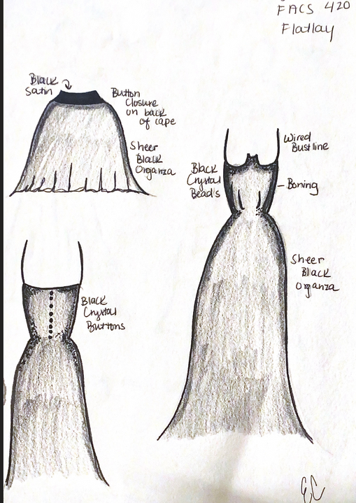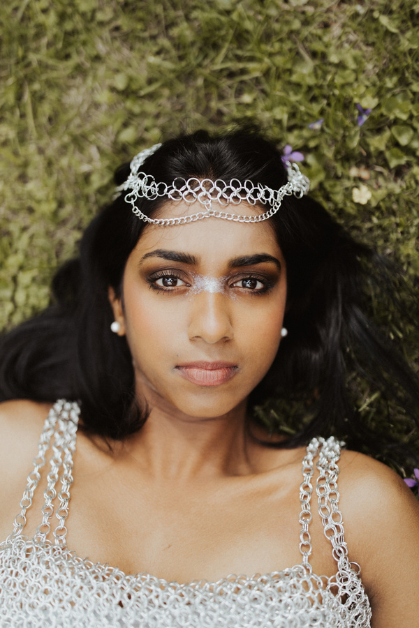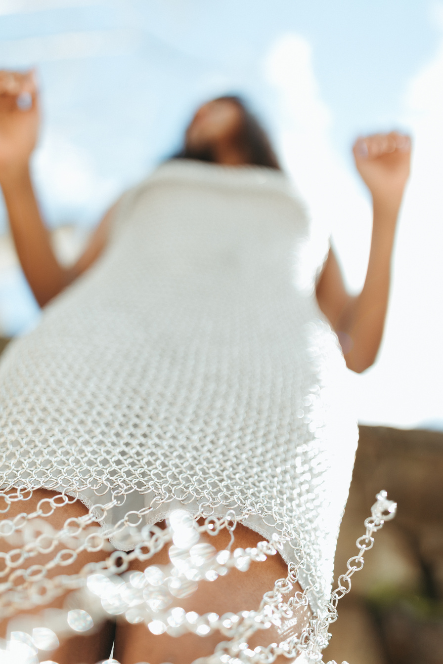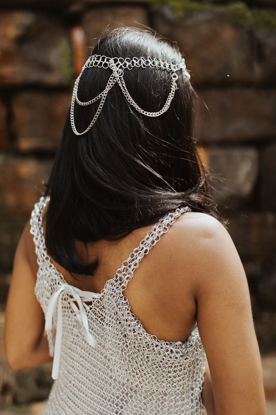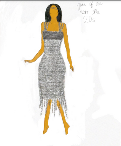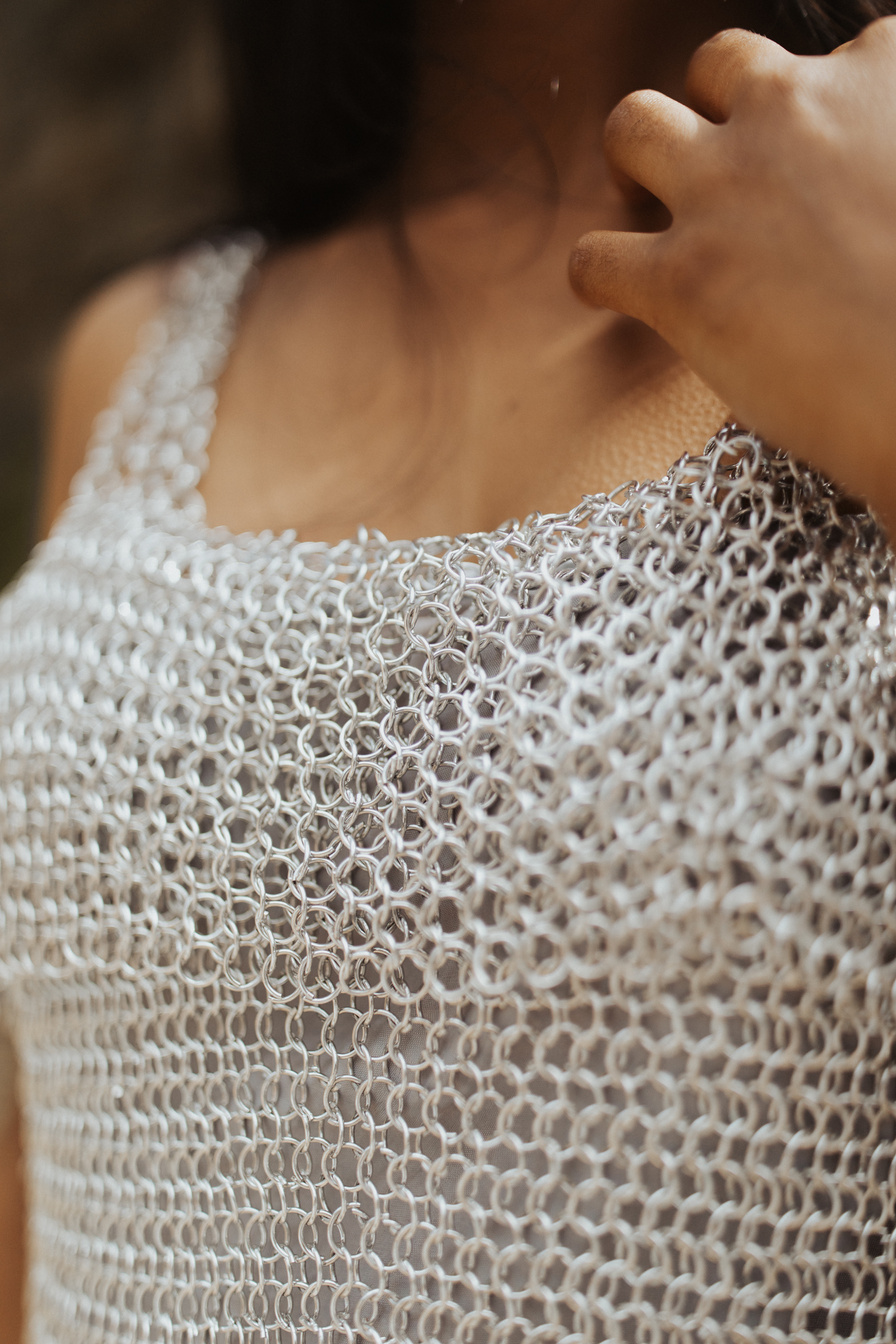 The concept for this piece was inspired by the question, "What if joan of Arc had lived a life of luxury instead of a life of martyrdom?" The silhouette drew from the flapper style of dress in the roaring 20s. The construction of this piece involved the interlocking of over 12,000 pieces of chainmail links, which took over 100 hours of work. my design received second place in the competition, which featured over 30 designers, and the award for best use of unconventional materials.