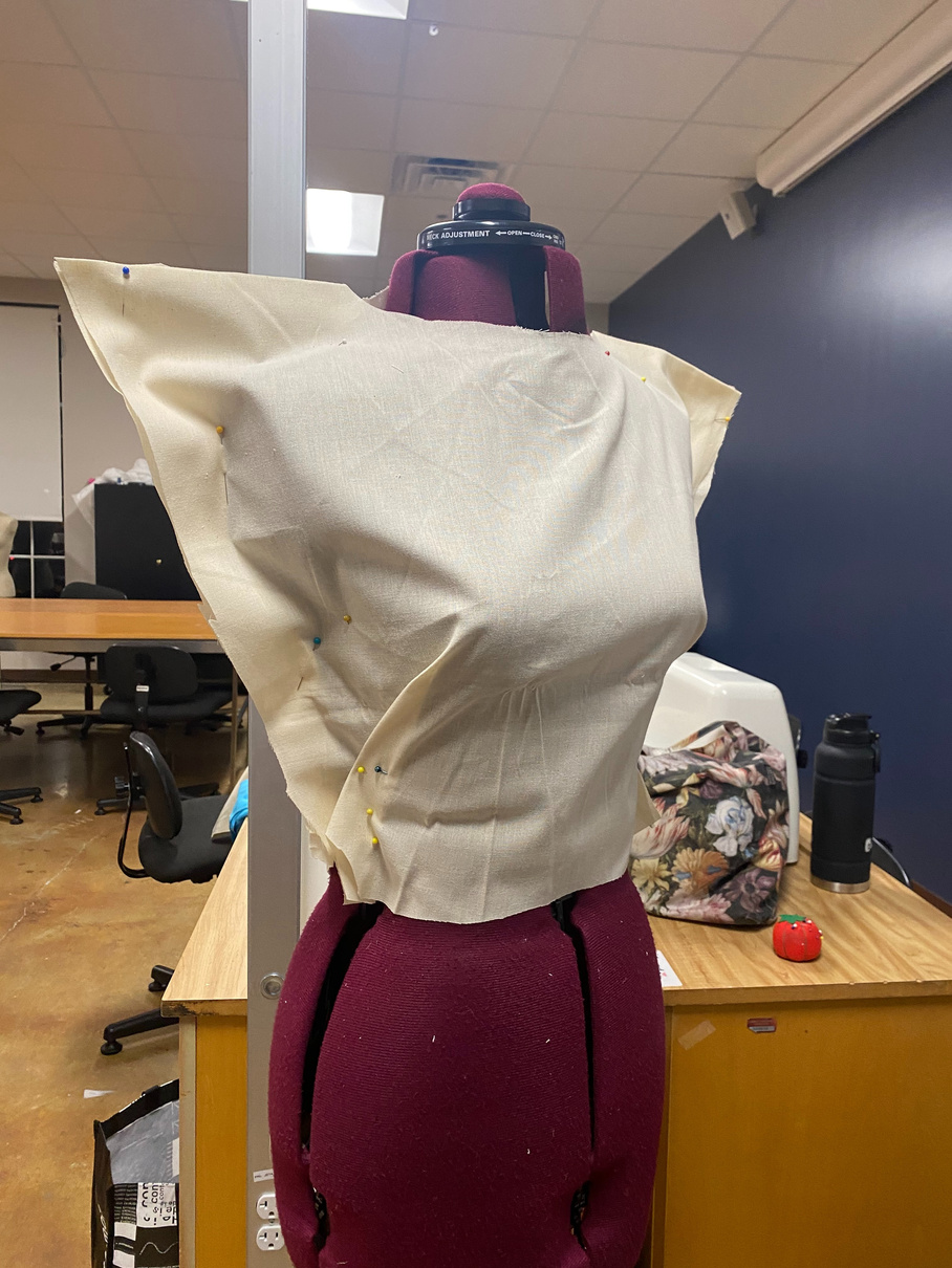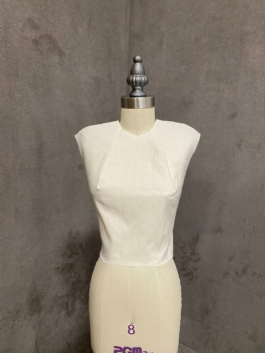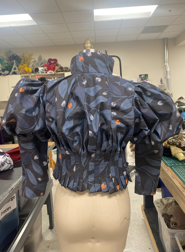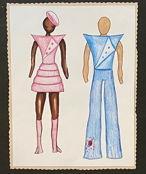 inspired by the album tranquility base hotel and Casino by the arctic monkeys, as well as the new-age space aesthetic RESULTing from the 1960s space RACE, these garments are my vision of staffing attire for an outer space hotel bellhop & conceirge. Featuring geometric silhouettes, these garments were constructed using scuba knit fabric, a hoop skirt base, and sinamay for a fascinator base. The production process included the conception of the idea, the collection of measurements and materials, the draping of the prototype on a model form, and the construction OF garments.