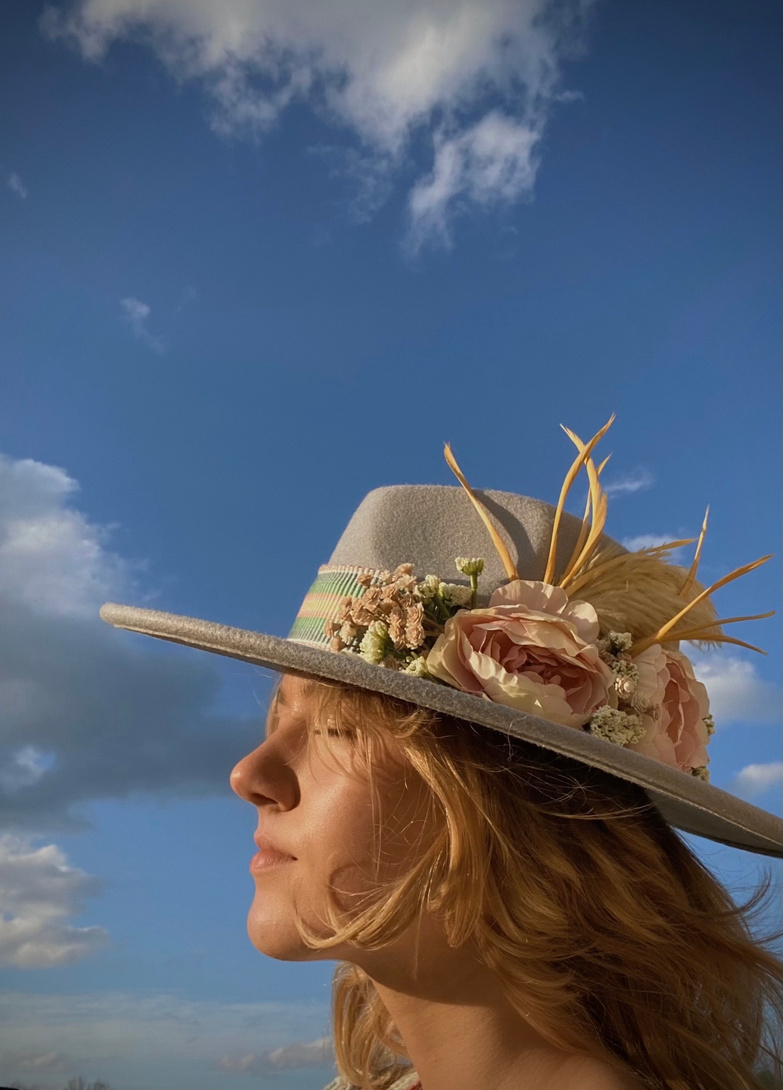 inspired by bob Dylan's rolling thunder revue tour and subsequent fashion style, i embellished this wool hat with hand-sewn natural fibers and florals that encapsulated the aura of this musical tour and bohemian era.
