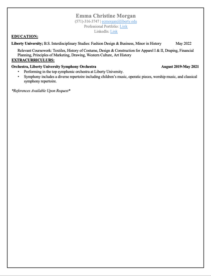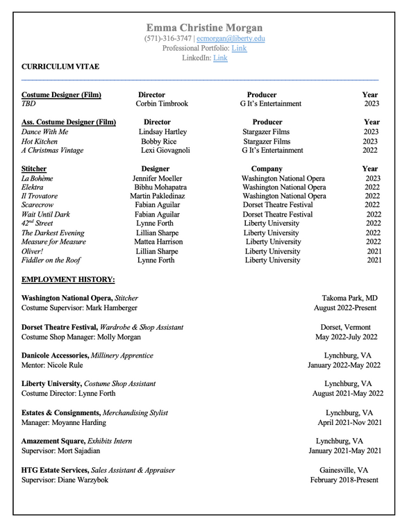 Hi! My name is Emma Christine. I am a costume designer, technician, and overall arts and design enthusiast. After completing an undergraduate degree in Fashion Design & History, I have been pursuing costume design & construction full-time. Over the past year, I have worked in theatre, opera, feature films, and episodic television. Here's just a glimpse into my work...