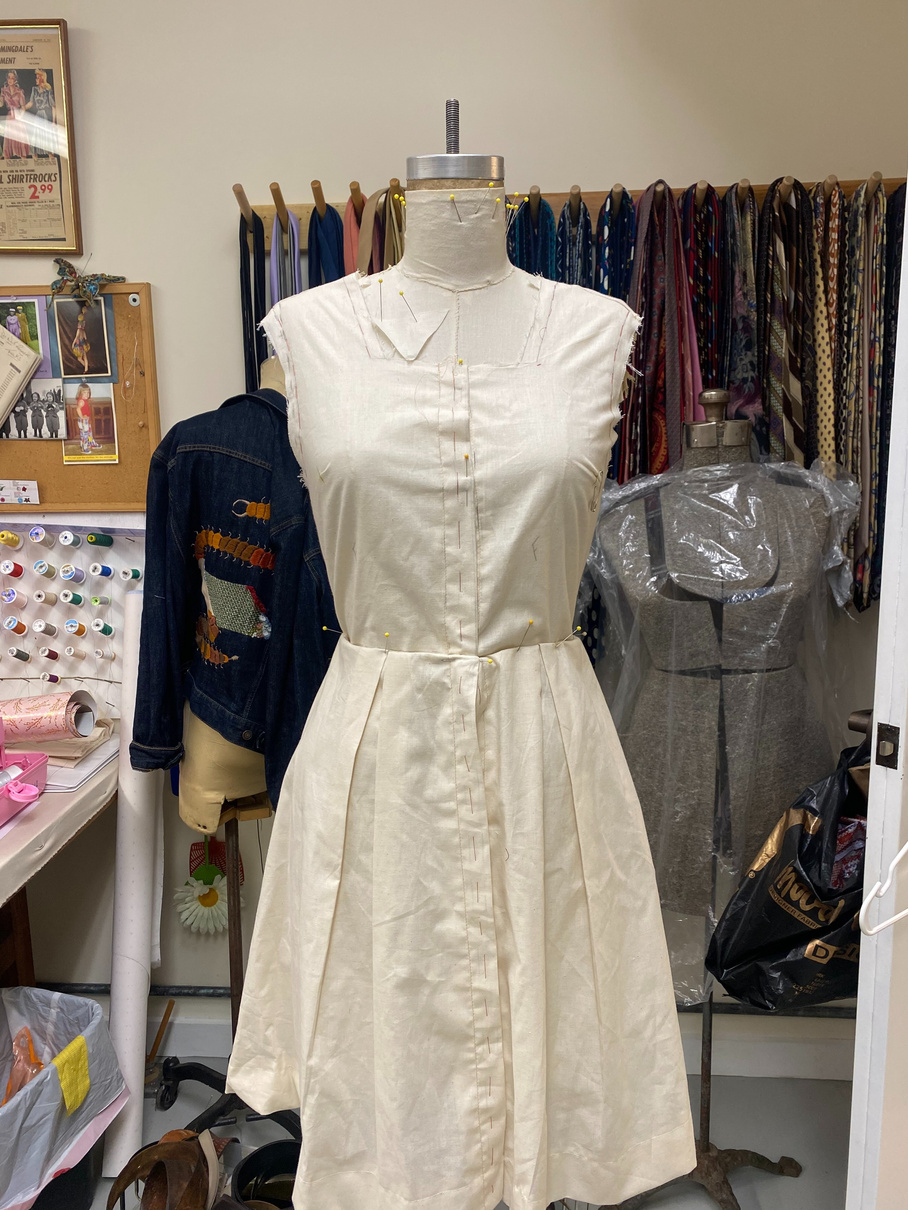 this restoration features a gown from the 1950s that had received water damage and cut on the sides with shears. I repaired the sides with careful stitching to preserve the integrity of the fragile fabric and I adjusted the bibble hem of the back folds. this project took careful work to keep the integrity of the fullness around the whole width of the skirt.
