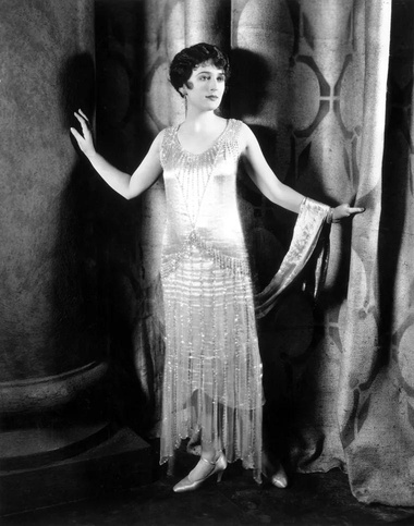 Circa 1925: Full-length portrait of a woman wearing a formal evening dress while standing in front of curtain. Getty Images